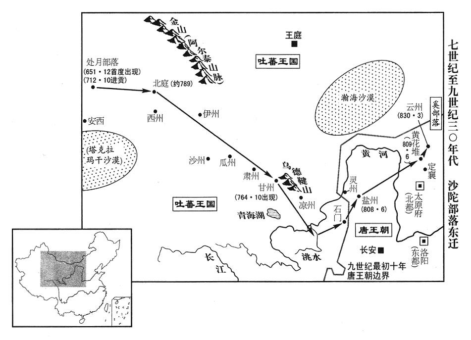 回鹘汗国攻击吐蕃(西藏),克复凉州(甘肃省武威市);吐蕃当权高官怀疑沙陀部落(甘肃省张掖市)可能重新回归回鹘,打算把沙陀迁到河外(这“河”不知道是什么河?可能指青海湖一带)。沙陀部落大为恐惧,酋长朱邪尽忠(朱邪,复姓)跟他的儿子朱邪执宜决定投奔唐王朝,于是率全体部落三万(是三万人或是三万张,说不清楚),沿着乌德鞬山(内蒙古阿拉善右旗南龙首山)向东进发,三天之后,吐蕃追兵大量赶到,两军缠斗,自洮水(黄河支流)辗转血战到石门(宁夏固原县北),数百次会战,沙陀军惨败,朱邪尽忠阵亡,士卒死亡大半。朱邪执宜率残余部众仍近一万人、骑兵三千人,投奔灵州(宁夏灵武市)归降。
