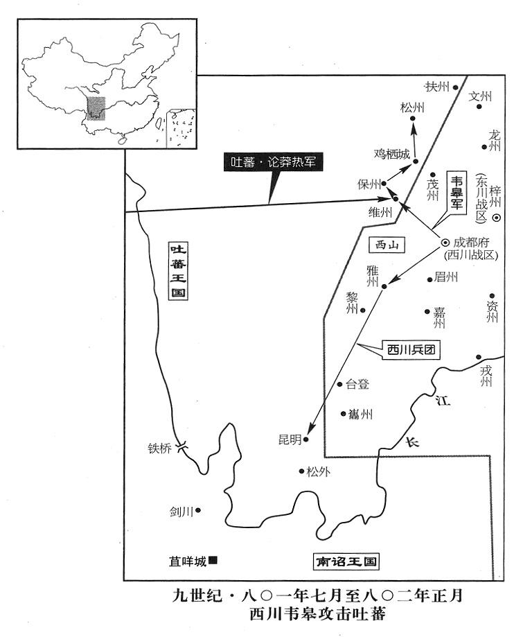 2、吐蕃王国(首都逻些城“〔西藏拉萨市〕”)派大宰相兼东方五战区司令官(东鄙五道节度使)论莽热,率十万人大兵团增援维州(四川省理县)。唐王朝(首都长安“〔陕西省西安市〕”)西川战区(总部设成都府“〔四川省成都市〕”)特遣兵团据守险要,设下埋伏,严阵以待。吐蕃军抵达时,西川兵团派一千人挑战诱敌,吐蕃军大举追击,进入伏兵口袋阵地,吐蕃军大败,西川兵团生擒论莽热,但士卒也死亡大半,始终无法攻陷维州、昆明(四川省盐源县),只好撤退。