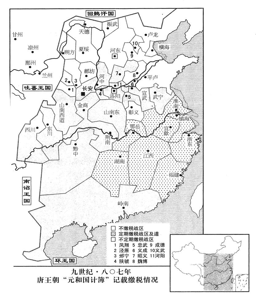 17、本年,宰相李吉甫编撰《元和国计簿》(即八〇七年《中国年鉴》)呈递皇帝(“元和”是李纯的年号),总计:全国四十八个战区和道、二百九十五个州和市(府)、一千四百五十三个县。其中除了凤翔战区(总部设凤翔府“〔陕西省凤翔县〕”)、鄜坊战区(总部设鄜州“〔陕西省富县〕”)、邠宁战区、振武战区(总部设单于府“〔内蒙古和林格尔县〕”)、泾原战区(总部设泾州“〔甘肃省泾川县〕”)、夏绥战区(总部设夏州“〔陕西省靖边县北白城子〕”)、朔方战区(总部设灵州“〔宁夏灵武市〕”)、河东战区(总部设太原府“〔山西省太原市〕”)、义武战区(总部设定州“〔河北省定州市〕”)、魏博战区(总部设魏州“〔河北省大名县〕”)、成德战区(总部设恒州“〔河北省正定县〕”)、卢龙战区、横海战区(总部设沧州“〔河北省沧州市东南〕”)、彰义战区(总部设蔡州“〔河南省汝南县〕”)平卢战区(总部设郓州“〔山东省东平县〕”)等十五战区七十一州,不向中央申报户口及呈缴赋税,每年一定向中央呈缴赋税的,只有浙东道、镇海战区、宣歙道、淮南战区、江西道、鄂岳道、福建道(首府设福州“〔福建省福州市〕”)、湖南道(首府设潭州“〔湖南省长沙市〕”)八战区道四十九州,一百四十四万户,比起七四二年所缴税户,减少四分之三。本年,全国军队由政府供应的有八十三万余人,比七四二年增加三分之一,大约平均两户人家供养一名士卒(七四二年时,全国设九战区及一指战区,军力合共四十九万士卒,八万余匹马,参考七四二年正月)。其中遇到旱灾、水灾所受的伤害以及法定赋税外的非法征收,还不包含在内。