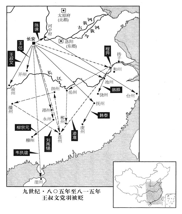 8、当初,王叔文的党羽受到贬谪(参考八〇五年七月),李纯颁发特别诏书,规定:“即令遇到赦免,也不可以酌量调向内地。”