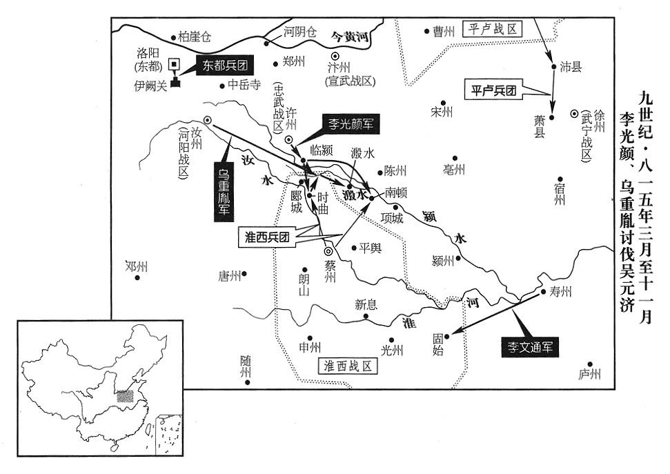 2、彰义(淮西)战区(总部设蔡州“〔河南省汝南县〕”)变军首领吴元济指挥他的军队四出掳掠抢劫,逼近东都洛阳(河南省洛阳市)近郊。