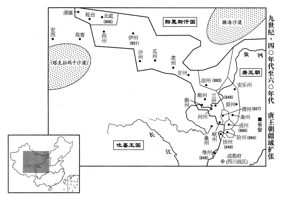 13、沙州警备区司令官(防御使)张义潮出军扫荡从吐蕃王国手中夺回的瓜州(甘肃省安西县)、伊州(新疆哈密市)、西州(新疆吐鲁番市东)、甘州(甘肃省张掖市)、肃州(甘肃省酒泉市)、兰州(甘肃省兰州市)、鄯州、河州(甘肃省临夏市)、岷州(甘肃省岷县)、廓州(青海省化隆县),总共十州。派他的老哥张义泽携带十一州(连同沙州)地图及重要档案,前往京师晋见,于是河湟(甘肃省及青海省东部)土地,全数回归唐朝版图。