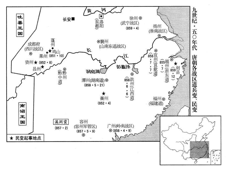12、浙东道(首府设越州“〔浙江省绍兴市〕”)变民首领裘甫攻陷象山(浙江省象山县),政府军不断挫败,明州(浙江省宁波市)城门白天都得关闭。裘甫变民军进逼剡县(浙江省嵊州市。剡,音shàn“〔善〕”。嵊,音shèng“〔胜〕”),拥有武装群众一百人,浙东道(浙江省东部)骚动,行政长官(观察使)郑祗德派副征剿司令(游击副使)刘勍(音qíng“〔晴〕”)、副将领范居植,率士卒三百人,会合台州(浙江省临海市)民兵,共同进击。
