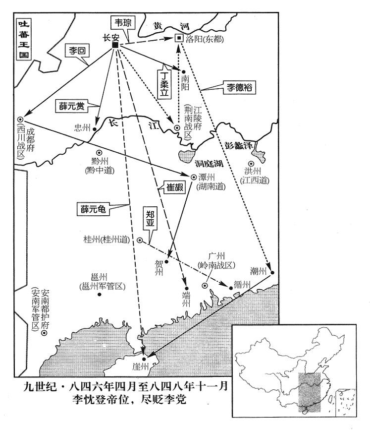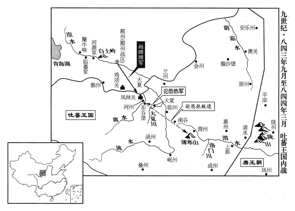 8、吐蕃王国(首都逻些城“〔西藏拉萨市〕”)自称宰相的论恐热,乘唐朝十八任帝李炎(李瀍)逝世,中央全神贯注举办丧事的时候,煽动各党项部落(陕西省北部)及回鹘残余部众,攻击河西(陕西省北部)。李忱下诏命河东战区(总部设太原府“〔山西省太原市〕”)司令官王宰率代北(山西省北部)各军迎战。王宰命沙陀部落酋长朱邪赤心当前锋,从麟州(陕西省神木县)西渡黄河(应是西渡黄河至麟州),前进到盐州(陕西省定边县),跟论恐热会战,把论恐热击退。