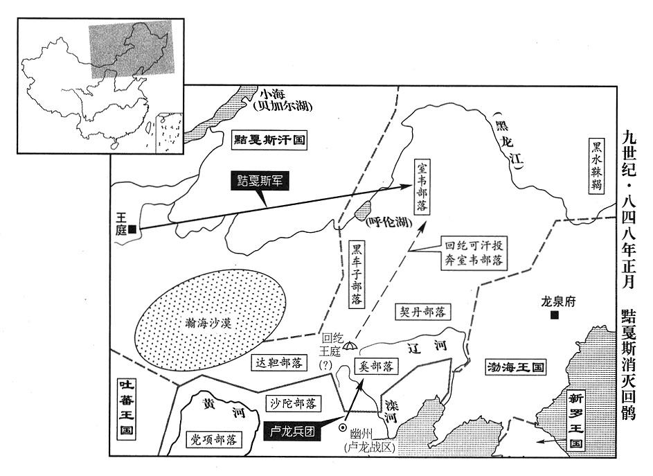 4、回鹘汗国(流亡不定)可汗(十六任大可汗)药罗葛遏捻,完全依靠奚部落(滦河上游)酋长(奚王)石舍朗供应;后来,卢龙战区(总部设幽州“〔北京市〕”)司令官张仲武大破奚部落(参考八四七年五月),回鹘失去靠山,连粮食都找不到,部众更加流失。现在,留下来的贵族及官员还不满五百人,只好投靠室韦部落(内蒙古东北部)。曾派遣使节到唐朝祝贺新年,经过幽州,张仲武命使节回去后诛杀药罗葛遏捻等。药罗葛遏捻听到消息,大为恐惧,于深夜时分,跟妻子葛禄、儿子药罗葛毒斯公爵等九人,骑马向西逃亡,残余部众追赶,已来不及,互相拥抱大哭。室韦部落遂把回鹘残余部众分配到七个不同姓的室韦支部安置。三天后,黠戛斯汗国(瀚海沙漠群)派宰相阿播,率各蛮夷部落军七万人前来消灭回鹘,大破室韦部落,把回鹘残余部众全部俘虏,押回瀚海沙漠群以北。但仍有漏网之鱼,几个残余篷帐,躲藏在山林里面,靠着劫掠其他蛮夷,维持残生。