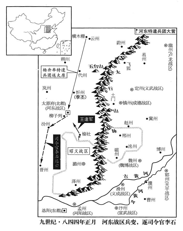 1、春季,正月一日,唐王朝(首都长安“〔陕西省西安市〕”)河东战区(总部设太原府“〔山西省太原市〕”)指挥官(都将)杨弁诛杀总作战司令(都头)梁季叶(音xié“〔协〕”),率领拥护自己的部众,到街市上大肆抢掠。战区司令官(节度使)李石,逃往汾州(山西省汾阳县)避难。杨弁遂占领总部,释放囚禁在监狱里的昭义战区(总部设潞州“〔山西省长治市〕”)变军使节贾群(参考去年“〔八四三年〕”十二月),命侄儿陪同贾群,一块前往潞州(山西省长治市)晋见变军首领刘稹,约定缔结兄弟之谊,刘稹大喜。石会关(山西省榆社县西)守将杨珍听到太原兵变消息,再把关城归降刘稹。