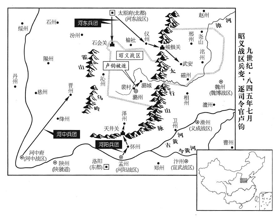 15、李瀍下诏命昭义战区(总部设潞州“〔山西省长治市〕”)派骑兵五百人、步兵一千五百人,前往振武战区(总部设安北府“〔内蒙古和林格尔县〕”)协防。战区司令官卢钧出城到裴村(长治市西北二千米)给他们饯行。昭义(总部潞州)士卒一向骄傲凶悍,不愿长程跋涉(潞州与安北府航空距离五百千米),于是几杯老酒下肚,挥转军旗,回军潞州(山西省长治市),关闭城门,高声呐喊呼叫,卢钧无法控制,逃奔潞城(山西省潞城县)躲避。监军宦官王惟直亲自出面向变军解释,变军把他围起来痛揍,伤势严重,十天后逝世。李德裕上疏说:“我建议下令河东战区(总部设太原府“〔山西省太原市〕”)司令官王宰,派步骑兵一千人进驻石会关(山西省榆社县西),三千人穿过仪州(山西省左权县),进驻武安(河北省武安市),切断变军与邢州(河北省邢台市)、洺州(河北省永年县东南旧永年镇)的联络(前往武安之军队,应是从峻极关“〔山西省左权县东南〕”穿过太行山)。再命河阳战区(总部设孟州“〔河南省孟州市〕”)司令官石雄率军进驻泽州(山西省晋城市);河中战区(总部设河中府“〔山西省永济市〕”)司令官韦恭甫派步骑兵一千人进驻晋州(山西省临汾市)。四面八方阻截下,盗贼毫无作为。”李瀍全部批准。九*九*藏*书*网