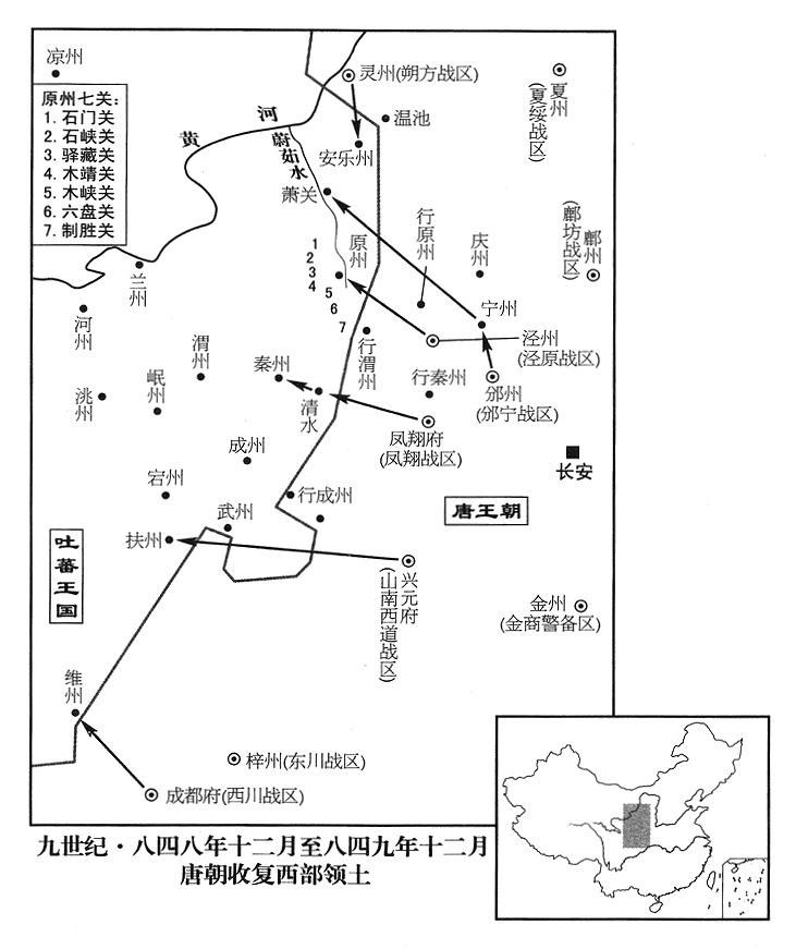 3、吐蕃王国(首都逻些城“〔西藏拉萨市〕”)所属的秦州(甘肃省秦安县西北)、原州(宁夏固原县)、安乐州(宁夏中宁县东北鸣沙洲)及石门(宁夏固原县西北二十五千米)等七关,归降唐王朝(七关均在原州州境,由北而南,石门关“〔固原县西北二十五千米〕”、驿藏关“〔固原县西〕”、制胜关“〔宁夏泾源县〕”、石峡关“〔固原县西北三十五千米〕”、木靖关“〔固原县西〕”、木峡关“〔固原县西南〕”、六盘关“〔宁夏隆德县东北〕”)。