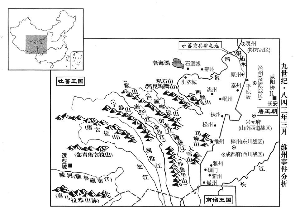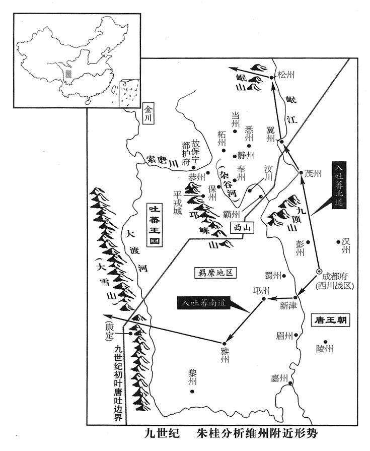 维州在成都西北,岷江西岸,杂谷河(杂谷脑河,注入岷江)北方,邛崃山高踞西境,岷山高踞北境,九顶山隔岷江高踞东境,三面都是三千五百米以上的崇山峻岭,仅东南沿杂谷河一线,曲折而到成都(维州至成都航空距离一百三十千米)。由成都前往吐蕃王国(西藏),有两条道路可走:一由成都西南行,经新津(四川省新津县)、邓州(四川省邛崃市)、雅州,横越大渡河,进入吐蕃国土;一由成都沿岷江东岸北行,经过茂州(四川省茂县)、松州(四川省松潘县),横越岷山,再进入吐蕃国土。两条路都不经过维州,只因维州西方的邛崃大山,“连岭而西,不知其极”。稍西的大雪山,更是“终年积雪如玉”,插翅难飞。即令上述两条道路,也不适合大军行动:由松州出境,必须翻过岷山、西倾山、积石山、巴颜喀喇等巨山;由雅州出境,则须翻过邛崃山、折多山、大雪山、宁静等巨山。而诸山之间,都紧夹着从北向南奔腾倾泻的急流,那种艰难险阻,绝不是坐在舒适的政府大厦里的官员所能想象。维州对外交通,除了东方可到汶川(四川省汶川县)外,只有沿杂谷河西北,穿过邛崃山区,抵达小金川(流经四川省小金县注入大金川),然而这也是采药人所走的羊肠小道,大军无法通行。吐蕃每次攻击维州,都由松州南下。七六三年,也是先攻陷松州,再攻陷维州和天保军(即保州·理县西北。参考七六三年十二月)。维州对成都的安全固然重要,但是如果强调它是“唐朝进兵西藏的要道”,则是诈欺。唐朝军队既不能横越万重高山向西出击,而松州当时仍在吐蕃之手,又怎么能通过它北伐?李德裕说:“河西陇右全都陷落,只维州仍存。”事实上,维州于七六三年跟松州同时沦陷,河西陇右并没有“仍存”(参考七六三年十二月),而在此之前,吐蕃已经攻陷京师(首都长安。参考七六三年十月),用不着先得到维州,才能东进。当时,中央可曾用维州牵制吐蕃?河西陇右的丧失,不由于先失维州,而九世纪五〇年代之收复河西陇右,也不因先收复维州(张义潮收复河湟十一州,参考八五一年十月)。试考察二十世纪三〇年代以前,可曾有谁率军由维州进入吐蕃?