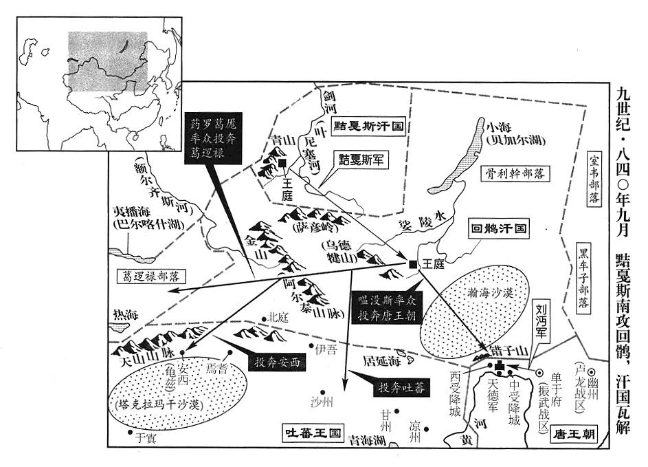 7、最初,伊吾(新疆哈密市)之西、焉耆(新疆焉耆县)之北,有黠戛斯汗国(黠戛,音xiájiá“〔匣荚〕”),也就是古代的坚昆汗国(参考前四九年二月),唐王朝初年的结骨部落(参考六四八年正月),后来改称黠戛斯部落(西伯利亚萨彦岭北)。八世纪五〇年代稍后(唐王朝十任帝李亨在位),被回鹘汗国(瀚海沙漠群)击破,遂跟唐朝隔绝。酋长阿热,中央御帐设于青山(叶尼塞河上游支流阿巴坎河西上祖布山),距回鹘王庭,骆驼行程四十日(航空距离五百千米),人民勇敢凶悍,吐蕃王国(首都逻些城“〔西藏拉萨市〕”)和回鹘汗国都对它时常馈赠贿赂,封酋长一个官衔,用来笼络安抚。回鹘国势衰退,阿热遂自称可汗。回鹘派宰相率军进攻讨伐,战争延续二十余年,回鹘不断被黠戛斯击败。阿热诟骂回鹘说:“你们的气数已尽,我一定夺取你们的金帐。”所谓金帐,指回鹘中央政府所在(蒙古国哈尔和林市)。