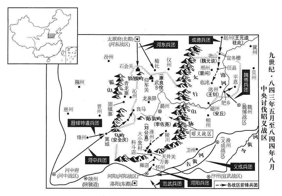 17、河阳战区司令官王茂元,率步骑兵三千人进驻万善(河南省沁阳市北);河东战区(总部设太原府“〔山西省太原市〕”)司令官刘沔,派步骑兵两千人进驻芒车关(山西省武乡县东北)、步兵一千五百人进驻榆社(山西省榆社县);成德战区司令官王元逵,派步骑兵三千人进驻临络(河北省永年县),劫掠尧山(河北省隆尧县);河中战区(总部设河中府“〔山西省永济市〕”)司令官陈夷行,派步骑兵一千人进驻翼城(山西省翼城县),另派步兵五百人劫掠冀氏(山西省安泽县南)。*