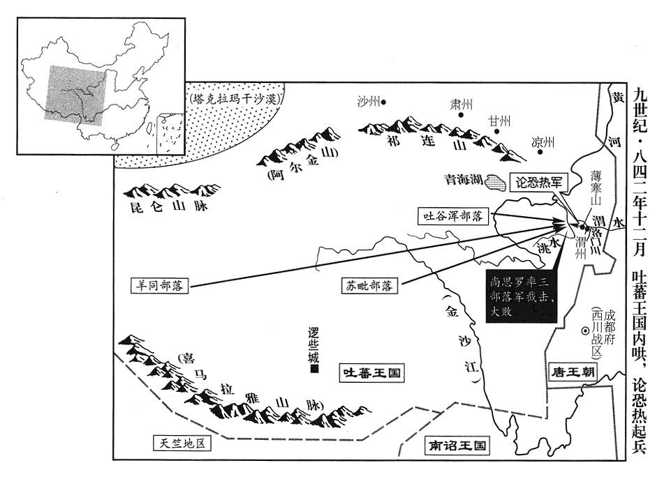 31、本月,吐蕃王国自称宰相的论恐热驻扎大夏川(发源甘肃省和政县南,注入洮水);鄯州战区(总部设鄯州“〔青海省乐都县〕”)司令官尚婢婢派将领厖结心(厖,音máng“〔茫〕”)及莽罗薛吕,率精锐士兵五万人进击,前进到河州(甘肃省临夏市)南,莽罗薛吕在险要地方埋伏四万人,厖结心则在柳树林里,埋伏一万人;然后率一千余骑兵登山,把辱骂论恐热的信件,绑在箭上,射进论恐热辖区。论恐热大怒,率军数万人追击,厖结心假装败退,还不时地假装人困马乏,行动困难,停留喘气,论恐热追击越发急迫,不知不觉已数十里,伏兵突然出现,截断论恐热的退路,前后夹攻,正巧狂风大起,飞沙走石,涧水河溪霎时间暴涨横溢,论恐热大败,尸体纵横五十里,淹死的不知道有多少;论恐热单人匹马逃回。