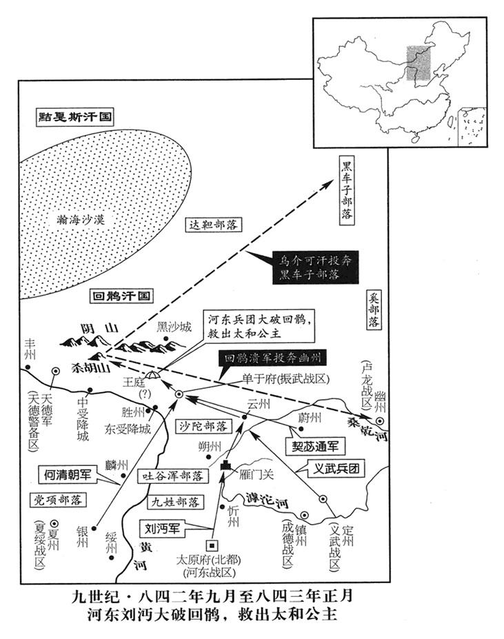 19、当初,黠戛斯汗国(西伯利亚萨彦岭北)击破回鹘汗国时,俘虏太和公主,遂自称是李陵的后裔(李陵投降匈奴,参考前九九年),跟唐王朝皇帝同姓(《新唐书·回鹘传》记载:黠戛斯人:“身材高大,赤发、白脸、蓝眼。”是典型的白种人,李陵后裔当是黑眼、黑发。为了政治利益,连自己的种族都强行否定,黠戛斯人提供一个例证),于是派将领(达干)十名,护送太和公主回归唐朝。回鹘乌介可汗(十五任大可汗)药罗葛乌希率军在中途埋伏,发动袭击,把黠戛斯汗国护送将领全部格杀,而把太和公主当做人质,渡瀚海沙漠南下,进入天德(内蒙古乌拉特前旗东北)边境。太和公主派人上疏给她的侄儿、唐朝皇帝李瀍,证实新可汗已经登基,请求对新可汗加封。药罗葛乌希又命他的宰相颉干伽斯等联合上疏,请求唐朝把振武城(振武总部单于府·内蒙古和林格尔县)借给回鹘,好让公主、可汗有安身之所。