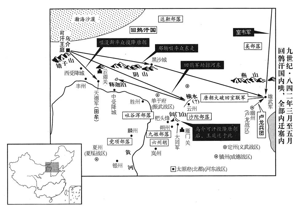 3、二月,回鹘仍留在王庭(设蒙古国哈尔和林市)附近的十三个部落,拥护公爵药罗葛乌希(硖跌乌希),称乌介可汗(十五任大可汗),南下据守错子山(内蒙古狼山东北)。