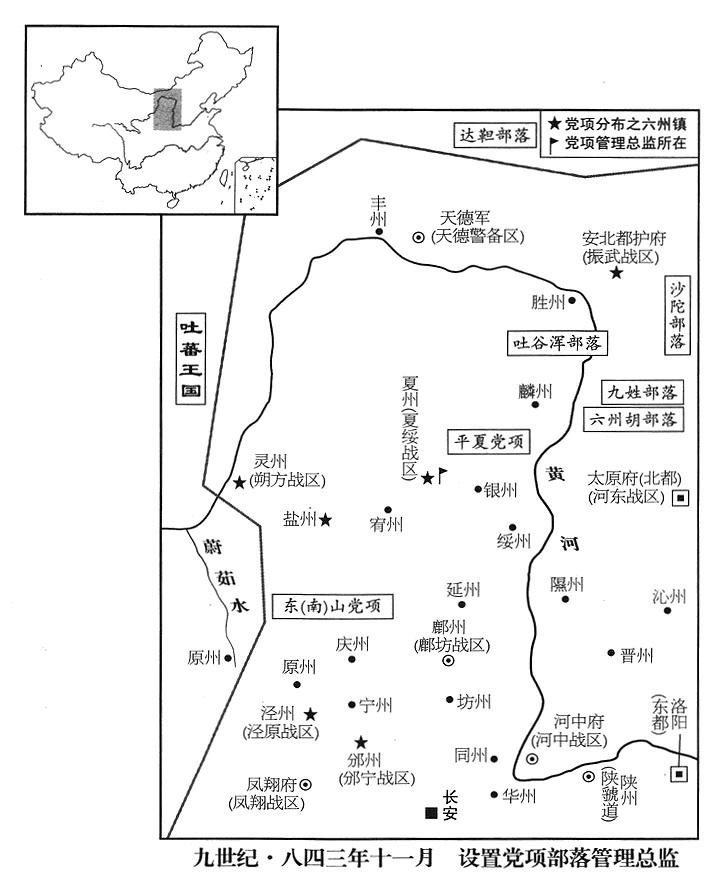 李瀍遂命兖王李岐(李瀍的儿子)当灵夏等六战区元帅,兼党项部落管理总监(安抚党项大使);命副总监察官(御史中丞)李回当党项部落副管理总监;国史馆编撰官(史馆修撰)郑亚当元帅府执行官(元帅判官);命二人携带诏书前往安抚党项部落及六个重镇的居民(六重镇:盐州“〔盐州道〕”、夏州“〔夏绥总部〕”、灵州“〔朔方总部〕”、泾州“〔泾原总部·甘肃省泾川县〕”、邠州“〔邠宁总部〕”、安北府“〔振武总部·内蒙古和林格尔县〕”)。