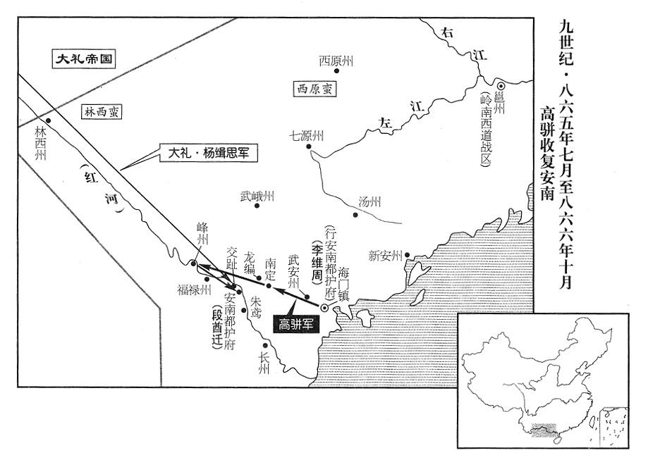 10、大礼帝国皇帝(一任帝)酋龙,派善阐战区(前拓东战区,总部设善阐府“〔云南省昆明市〕”)司令官杨缉思增援安南战区(总部设安南府“〔越南河内市〕”)司令官段酋迁,协助防守交趾(安南府所在城);命范昵些当安南(越南河内市)总指战官(都统)、赵诺眉当扶邪(罗伏州·越南海万市)总指战官。恰巧,监营宦官(监阵敕使)韦仲宰率七千人抵达峰州(河内市西北永安县)增援,遂跟高骈军会合,高骈军力增强,向大礼军发动攻击,屡次都把大礼军击破,捷报传到海门(行交州·越南海防市),监军宦官李维周却把它压下来,以致数月之间,高骈下落如石沉大海,没有一点消息。李漼大为奇怪,派宦官询问李维周,李维周奏报说:“高骈驻扎峰州,玩弄敌寇,不肯前进!”李漼大怒,派右武卫(卫军第四军)将军王晏权代替高骈当安南都护,命高骈回京,打算加重贬谪。王晏权,是王智兴的侄儿(有误。参考八四四年三月三日)。