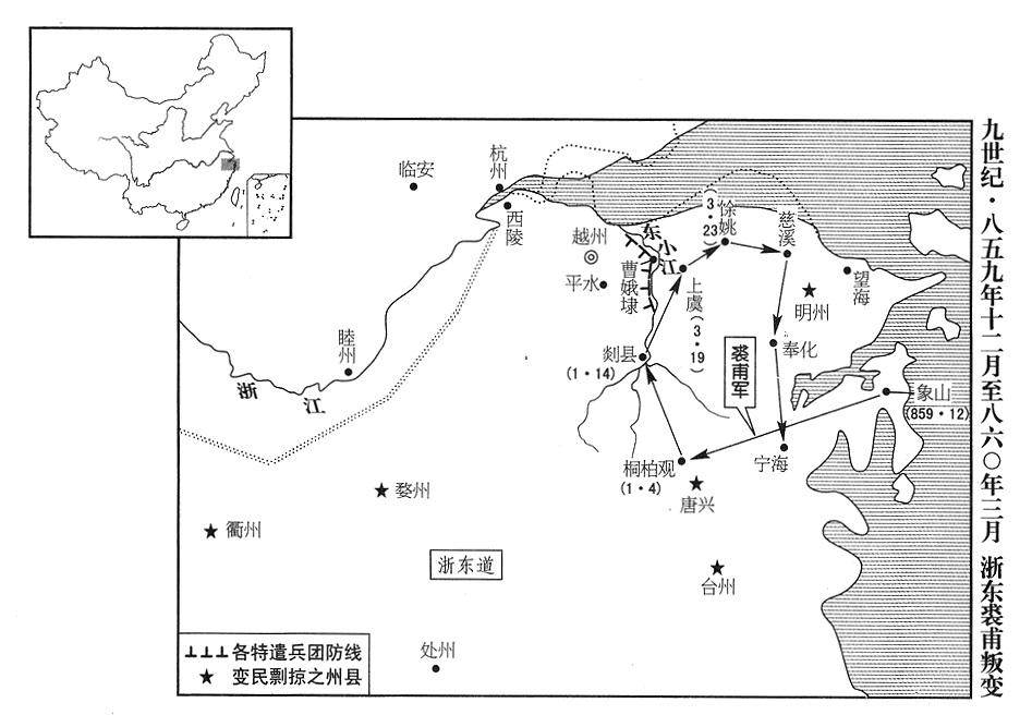 4、浙东道行政长官(观察使)郑祗德上疏奏报情况危急,要求支援,一面向邻近各战区道求救。浙西道派营门官(牙将)凌茂贞率四百人,宣歙道(首府设宣州“〔安徽省宣州市〕”)派营门官白琮率三百人,分别前往。郑祗德先派他们驻防外城郭门以及东小江(曹娥江),不久又把他们调回保护首府。郑祗德对这些来自外道的特遣兵团,所作供应,超过全国财政总监署(度支)正常供应的十三倍,可是两道士卒仍认为不够。当两道准备出击,请浙东道将士当向导时,浙东将士有的声称有病在身,有的伪装从马背摔下受伤;即令肯当向导,也要先谈妥升迁的官职阶级,即令如此,争执到最后,两道仍然不能出击。变民军斥候部队挺进到平水东小江(曹娥江支流),越州城中士绅及庶民都准备好小船,身裹粮食,从初夜坐到天明,打算各自逃生。