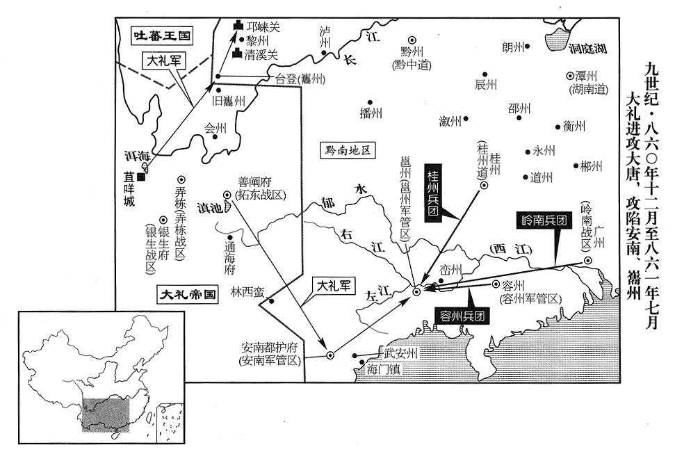 4、大礼帝国(首都苴咩城“〔云南省大理市〕”)再度攻击安南军管区(首府设安南府“〔越南河内市〕”),军事指挥官(经略使)王宽不断向中央求救,中央派前湖南道(首府设潭州“〔湖南省长沙市〕”)行政长官(观察使)蔡袭接替王宽的职位,同时动员忠武(总部许州)、义成(总部滑州)、武宁(总部徐州)、宣武(总部汴州)、荆南(总部江陵府)、山南东道(总部襄州)、湖南(首府潭州)、鄂岳(首府鄂州)八战区道共三万人,交给蔡袭指挥,声势浩大,大礼军(云南省)即行撤退。