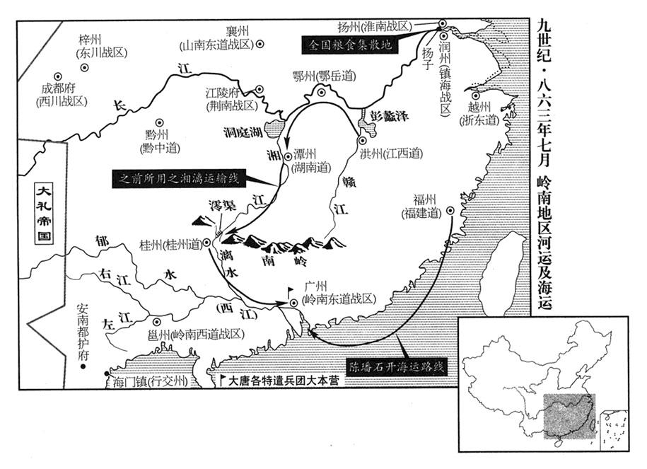 当时各战区道支援安南(交州·越南海防市)援军,集结岭南(南岭以南)。江西(首府洪州)、湖南(首府潭州)运输军粮,都要逆水行舟,从湘江进灵渠(联络漓江与湘江之间的人工运河),再进漓水(桂江上游),费用庞大,万般艰苦,各特遣兵团总是缺粮。润州人陈磻石(磻,音pán“〔盘〕”)上疏建议:“建造可以装载一千斛以上粮食的运输船,从福建道(首府设福州“〔福建省福州市〕”)启航,经过台湾海峡、南海,用不了一个月,就可运到广州(岭南东道战区总部·广东省广州市)。”中央接受,军中粮食供应才开始充足。