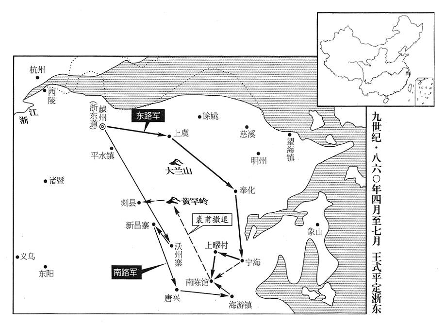 先前,王式因正规军太少,上疏请求征调忠武战区(总部许州)、义成战区、昭义战区部队,李漼下诏批准。现在,三战区特遣兵团前后抵达越州,王式命忠武将领张茵率军三百人驻防唐兴,切断变民军南下要道;义成将领高罗锐率军三百人,加上台州民众自卫队,直向宁海,进攻变民军的主要根据地;昭义将领跌戣率军四百人(跌,回鹘可汗姓),增援东路军,切断变民军进入明州(浙江省宁波市)要道。