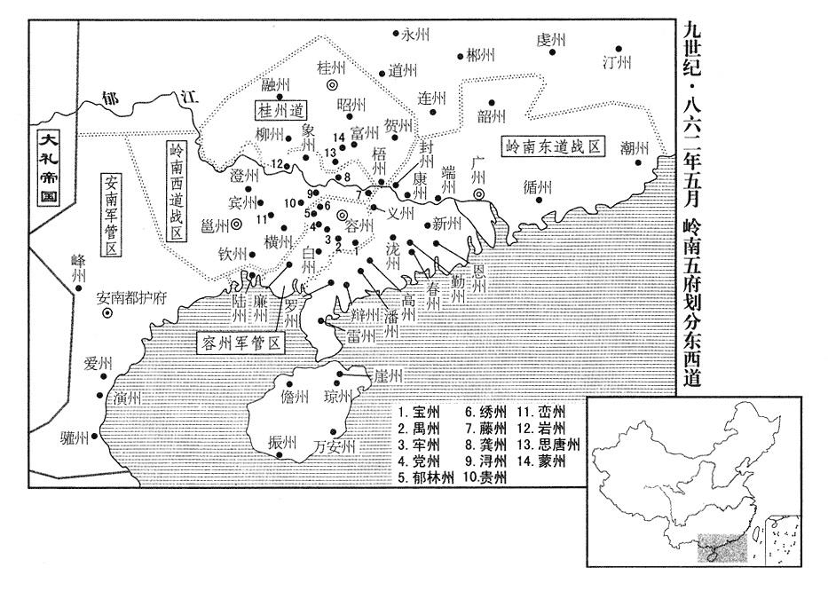 12、五月十三日,撤销容州军管区(首府设容州“〔广西容县〕”),各州改隶岭南西道战区,再把龚(广西平南县)、象(广西象州县)二州,划归桂州道(二州改隶岭南西道,参考八六二年五月)。