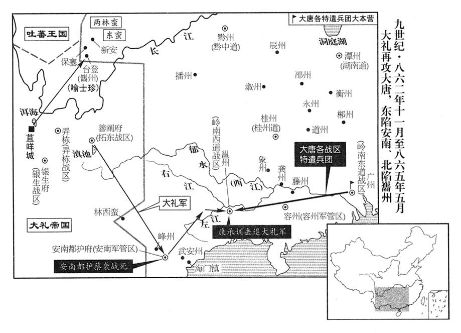 15、大礼帝国(首都苴咩城“〔云南省大理市〕”)远征军五万人,大举攻击安南(越南河内市),都护蔡袭紧急向中央请求救援,李漼敕令荆南战区(总部设江陵府“〔湖北省江陵县〕”)、湖南道各出军两千人,加上桂州道志愿军(义征子弟)三千人,增援邕州,由岭南西道战区司令官郑愚指挥。