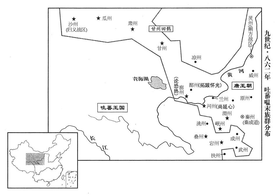 1、春季,二月,唐王朝(首都长安“〔陕西省西安市〕”)归义战区(总部设沙州“〔甘肃省敦煌市〕”)司令官(节度使)张义潮奏报说:“北庭(新疆吉木萨尔县)回鹘部落酋长固俊,一连从吐蕃王国(首都逻些城“〔西藏拉萨市〕”)手中夺回西州(新疆吐鲁番市东)、轮台(新疆乌鲁木齐市)、庭州(北庭·新疆吉木萨尔县)、清镇(新疆沙湾县东)等城池(西州是张义潮收复的河湟十一州之一,参考八五一年十月;或之后吐蕃夺回)。”