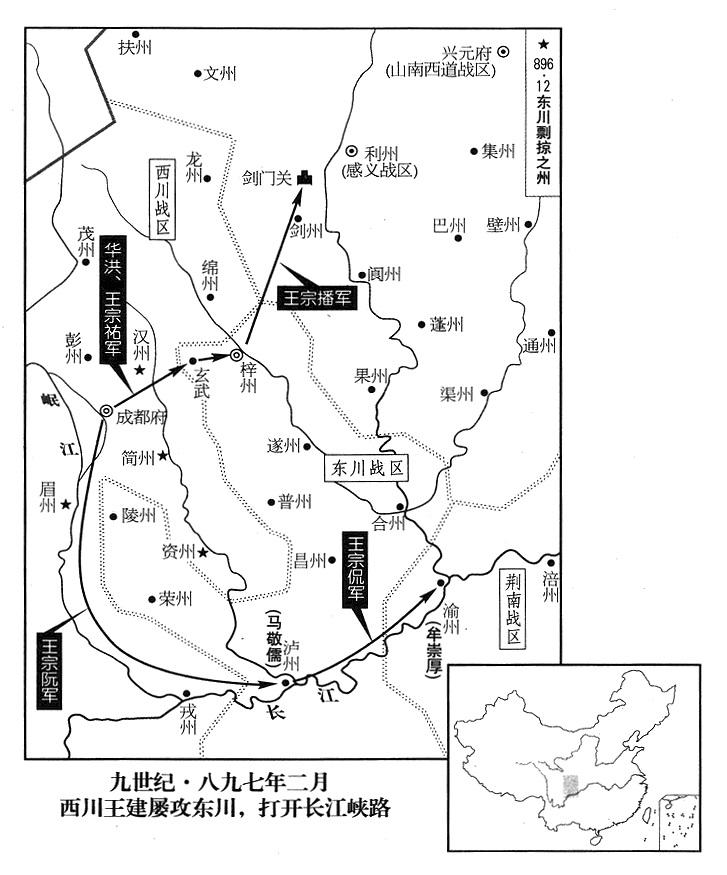 29、九月二十二日,东川战区(总部设梓州“〔四川省三台县〕”)候补司令官王宗涤(华洪)向王建说:东川疆域五千里,公文往返,动不动就要数月,不如分出遂(四川省遂宁市)、合(重庆合川市)、庐(四川省泸州市)、渝(重庆市)、昌(重庆市大足县)五州,另行设立战区。王建同意,上疏奏报中央。