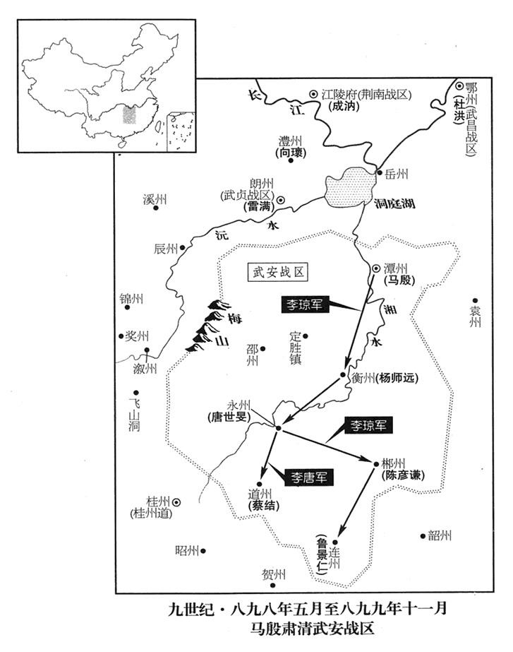 21、武安将领姚彦章建议战区候补司令官马殷出军夺取衡(湖南省衡阳市)、永(湖南省永州市)、道(湖南省道县)、连(广东省连州市)、郴(湖南省郴州市)五州,并推荐李琼当讨伐军统帅。马殷遂任命李琼及秦彦晖(蔡州皇帝秦宗权的族弟,参考八八七年十月)当岭北(南岭以北)七州(武安战区所辖七州)游击司令(游弈使),张图英、李唐当副游击司令,率军进攻衡州,斩变民首领杨师远;又进攻永州,包围一个月有余,变民首领唐世旻逃走,死在路上。马殷命李唐当永州州长。