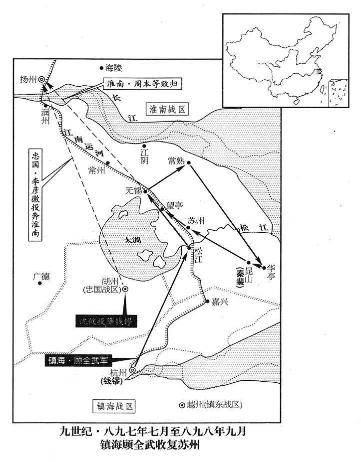 16、淮南特遣兵团跟镇海特遣兵团,在皇天荡(江苏省苏州市境)会战,镇海特遣兵团失利。杨行密遂包围苏州(江苏省苏州市)。