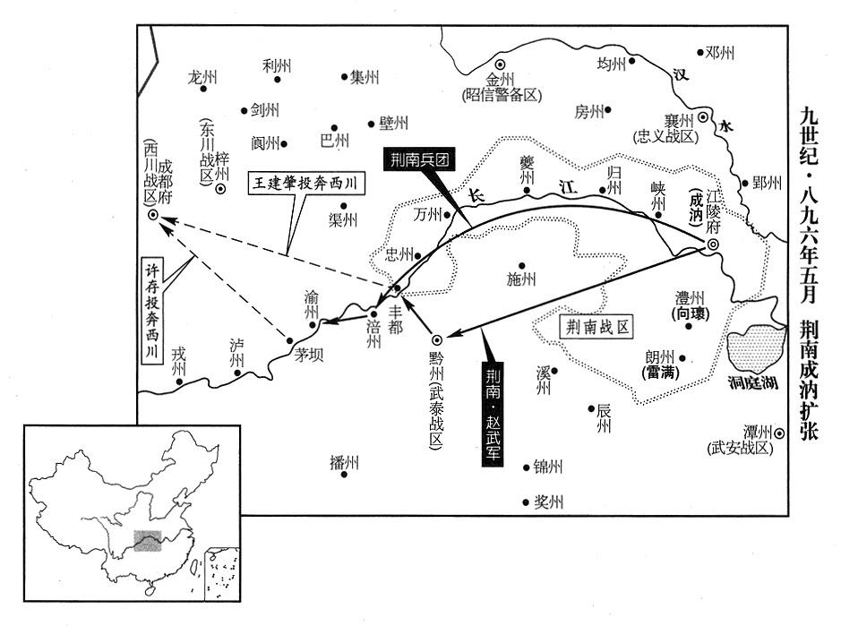 24、荆南战区(总部设江陵府“〔湖北省江陵县〕”)司令官成汭(郭禹),跟他的部将许存,逆长江西上,夺取土地,沿江州县,全被占领。武泰战区(总部设黔州“〔重庆市彭水县〕”)司令官王建肇不能抵抗,放弃黔州,收拾残余部众,退保丰都(重庆市丰都县)。