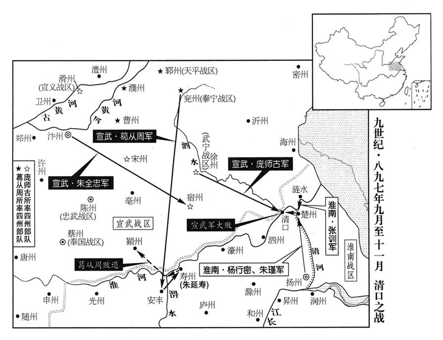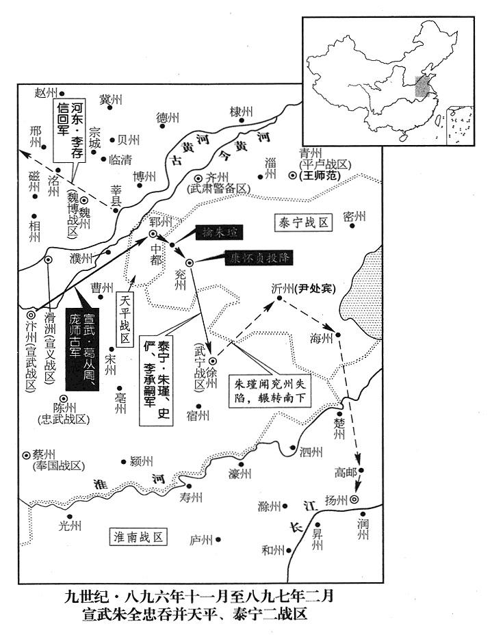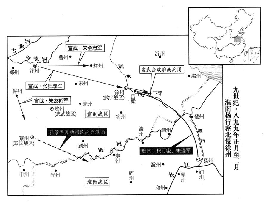 3、杨行密(杨行愍·淮南“〔总部扬州〕”司令官)跟朱瑾(前泰宁“〔总部兖州〕”司令官)率士卒数万人进攻徐州,进驻吕梁(江苏省徐州市东南)。朱全忠派骑兵将领张归厚增援徐州。