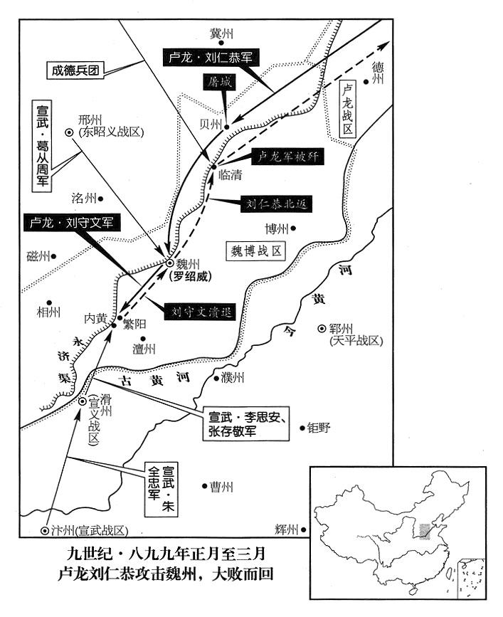 4、刘仁恭(卢龙“〔总部幽州〕”司令官)征调幽(北京市)、沧(河北省沧州市东南)等十二州武装部队十万人,浩浩荡荡南下,打算扫平河朔(河北平原)。首先进攻贝州(河北省清河县),攻克,屠城,城里一万余户居民,全部格杀,把尸体投到清河(永济渠)。于是,所有城池都顽强守卫,拒不投降。刘仁恭采取跳蛙战术,直接进攻魏州(河北省大名县),在城北扎营。魏博战区(总部设魏州“〔河北省大名县〕”)司令官罗绍威向朱全忠求救。