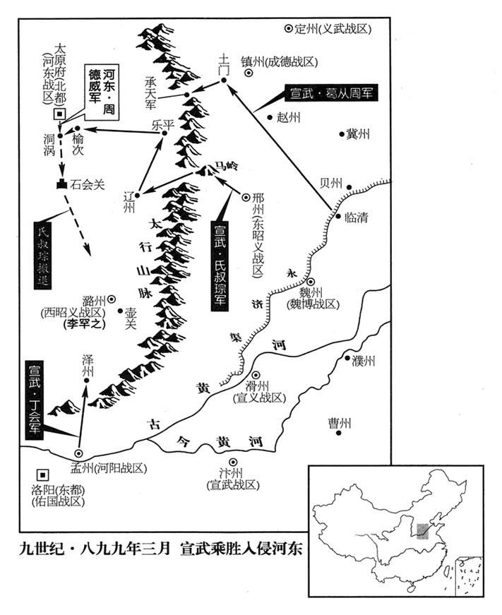 8、葛从周乘击破卢龙的声势,自土门(河北省鹿泉市西南)出发,进攻河东,攻陷承天军(山西省平定县东北娘子关),别动部队将领氏叔琮自马岭(河北省邢台市西北)深入,攻陷辽州(山西省左权县)、乐平(山西省昔阳县),直扑榆次(山西省榆次市)。李克用派内院卫军副司令(内牙军副)周德威迎击。