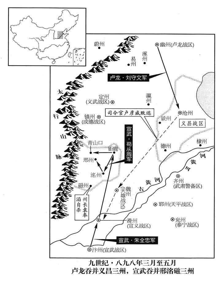 朱全忠跟刘仁恭建立友谊,正巧,魏博兵团(总部魏州)攻击李克用。